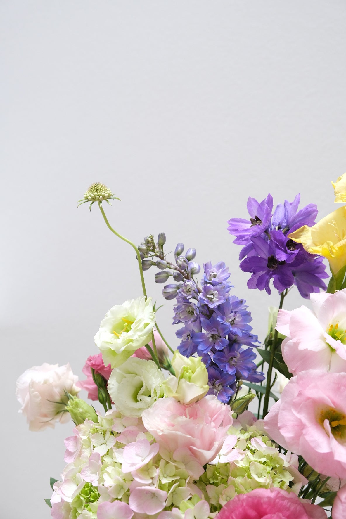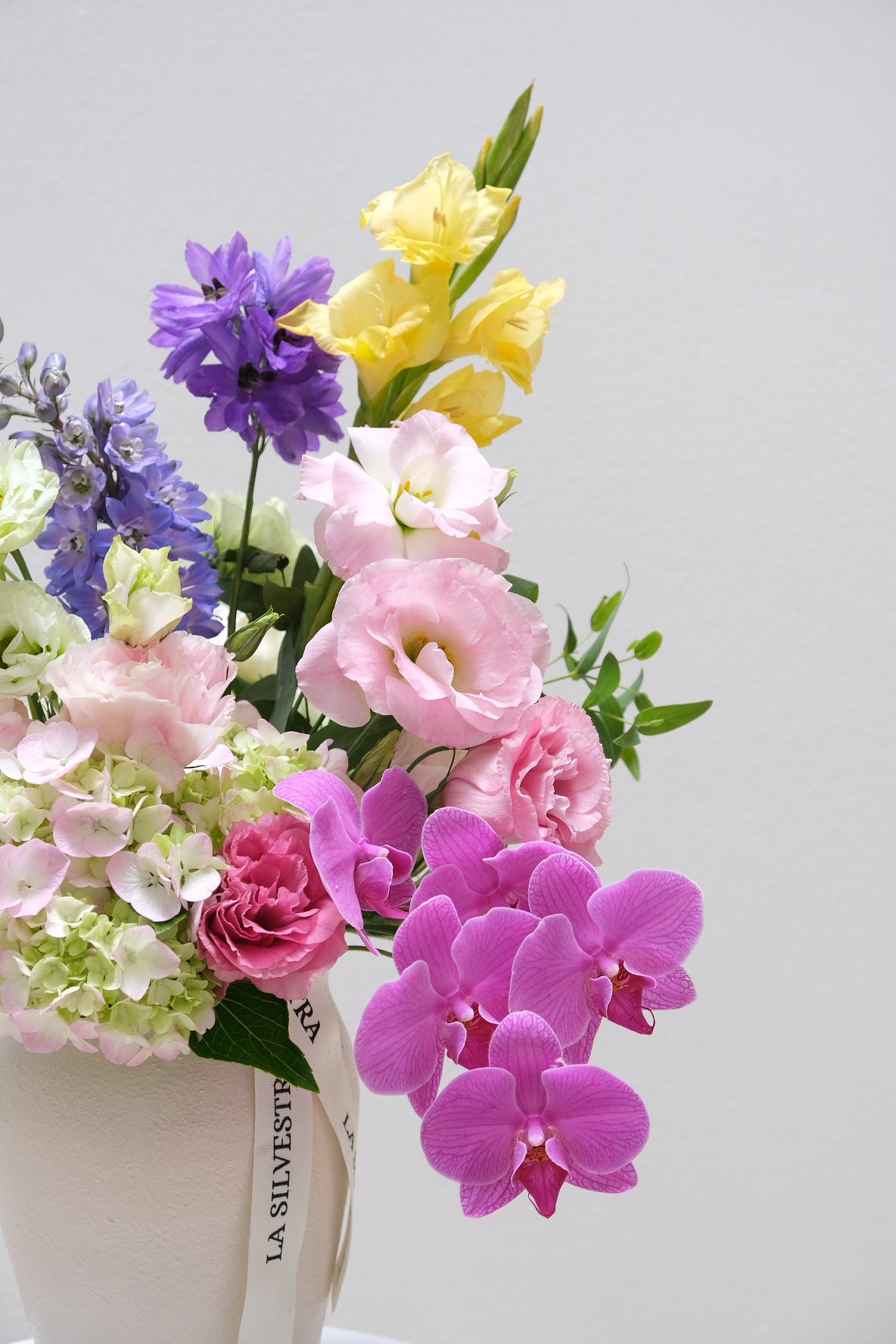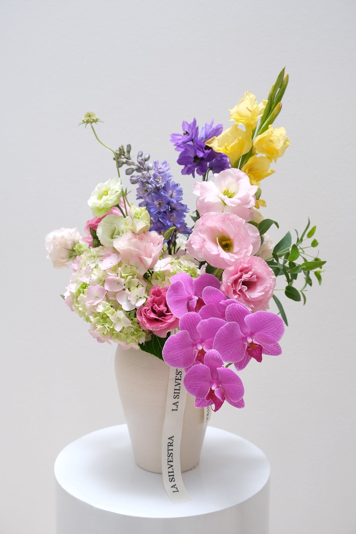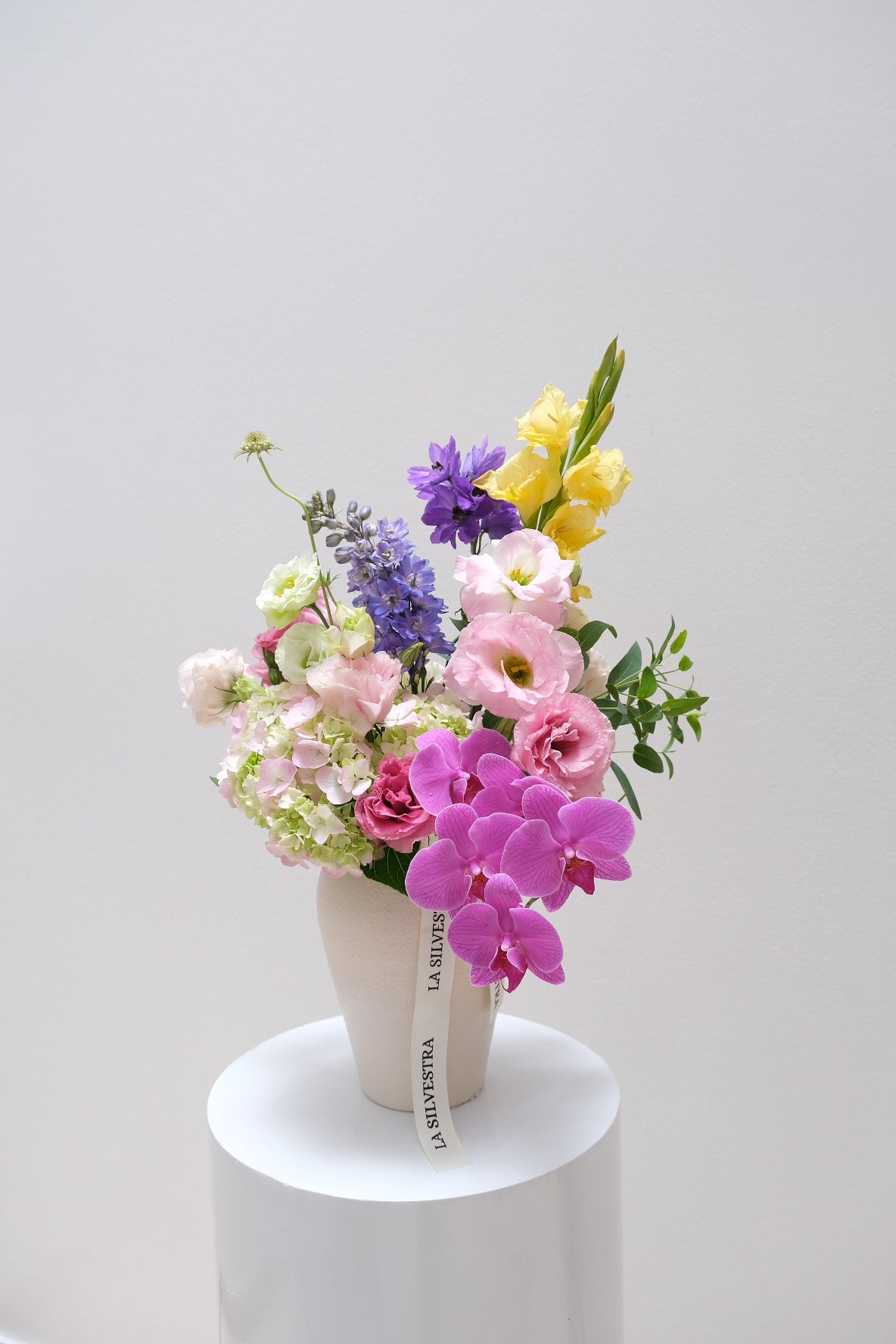 Composición hecha a base de lisianthus, orquídea, escabiosa, entre otras flores silvestres y de temporada. Todo sobre un jarrón de cerámica hecha a mano.
