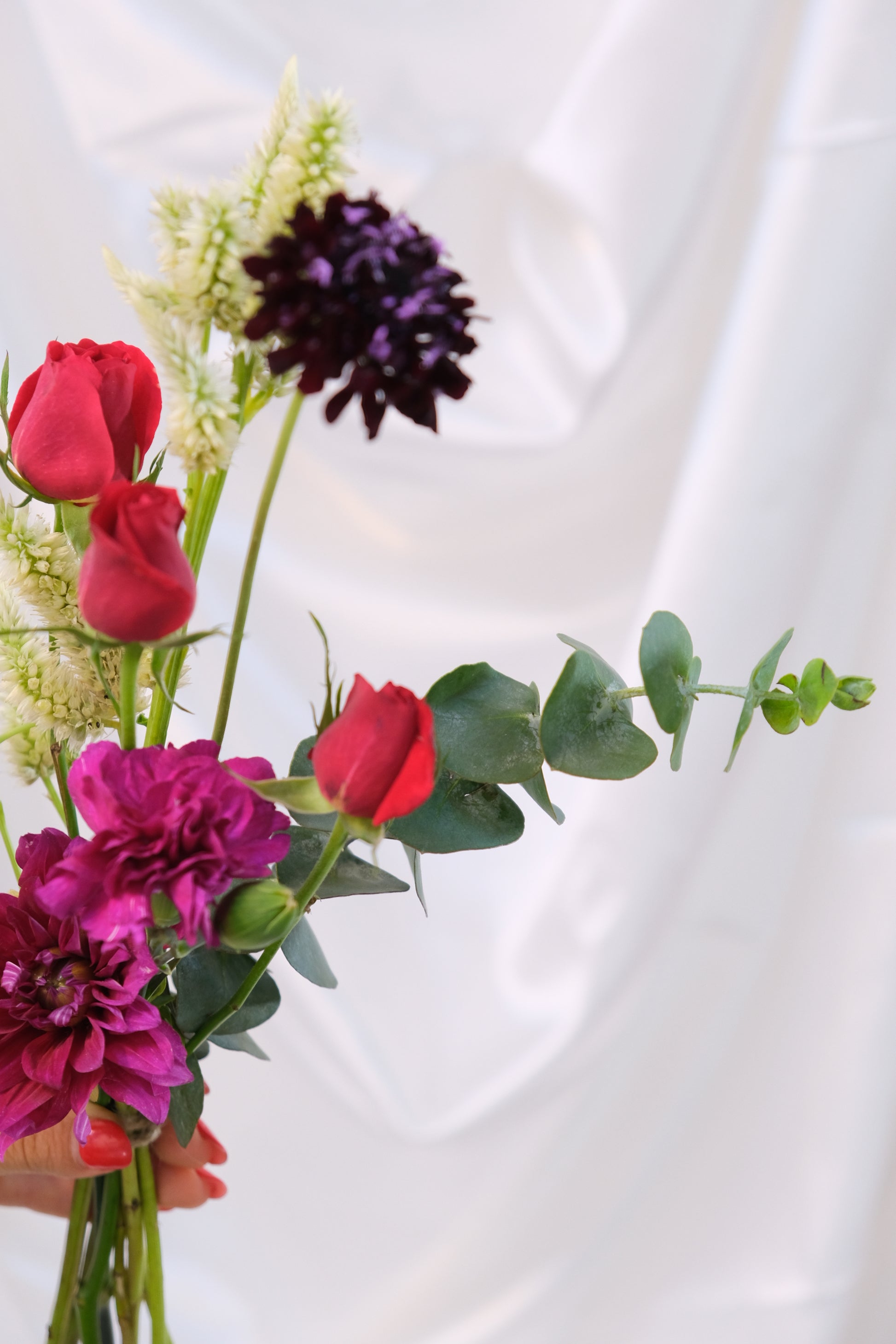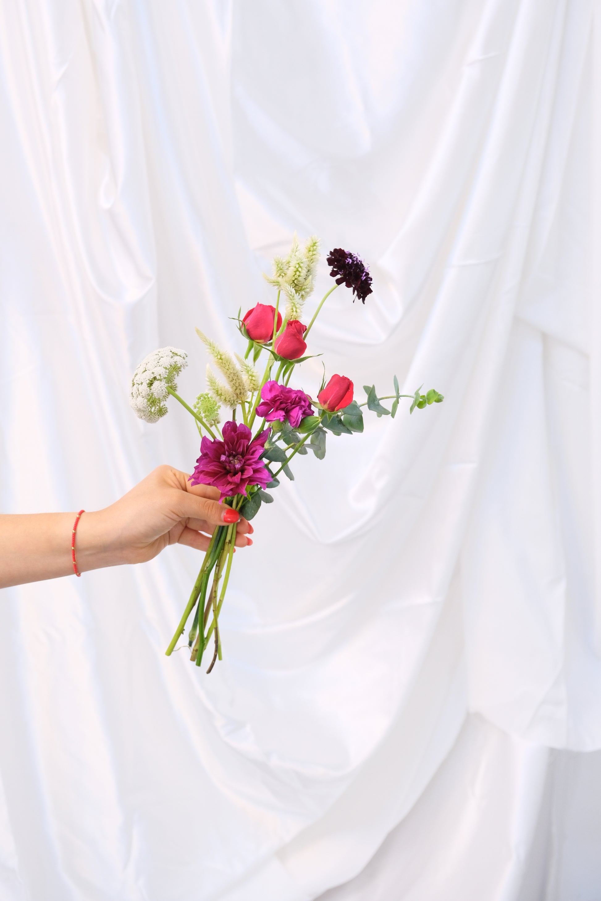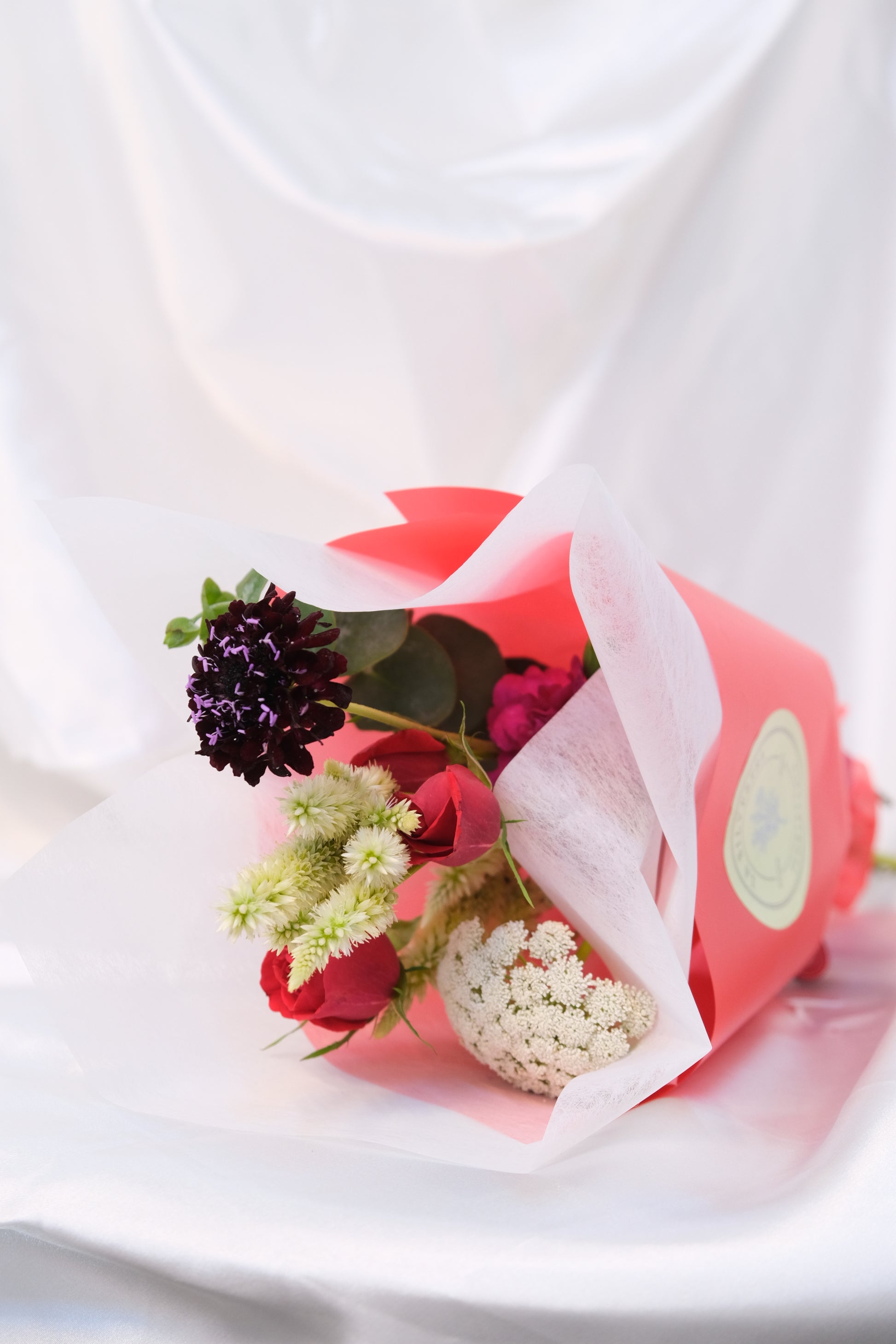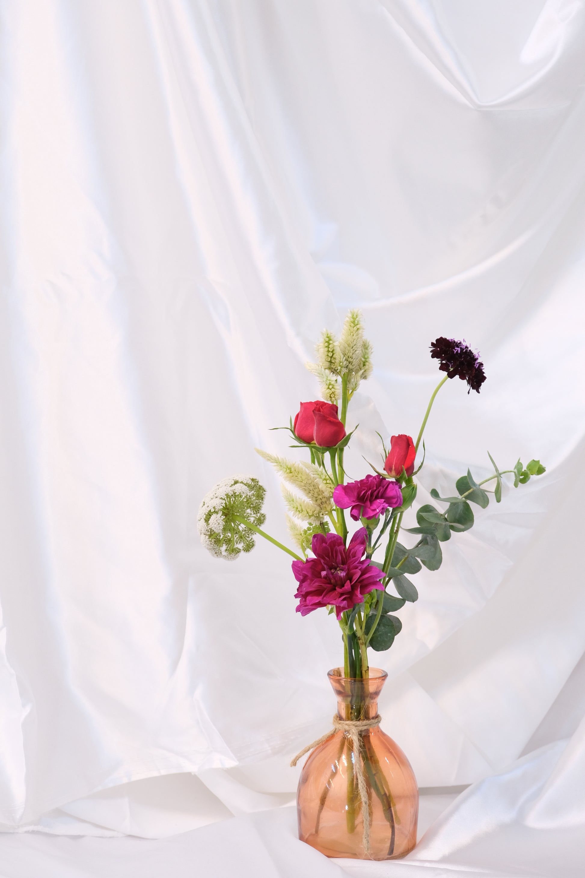 Puede incluir Escabiosas, Claveles, Celosías, Rosas, Eucaliptos, Lisianthus, Piracanto, etc.