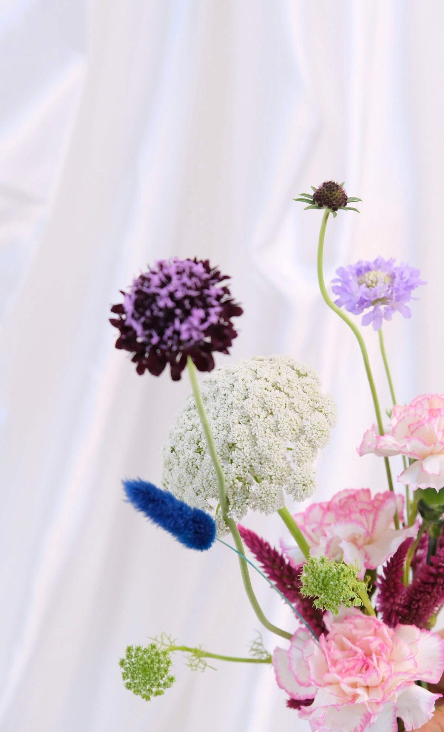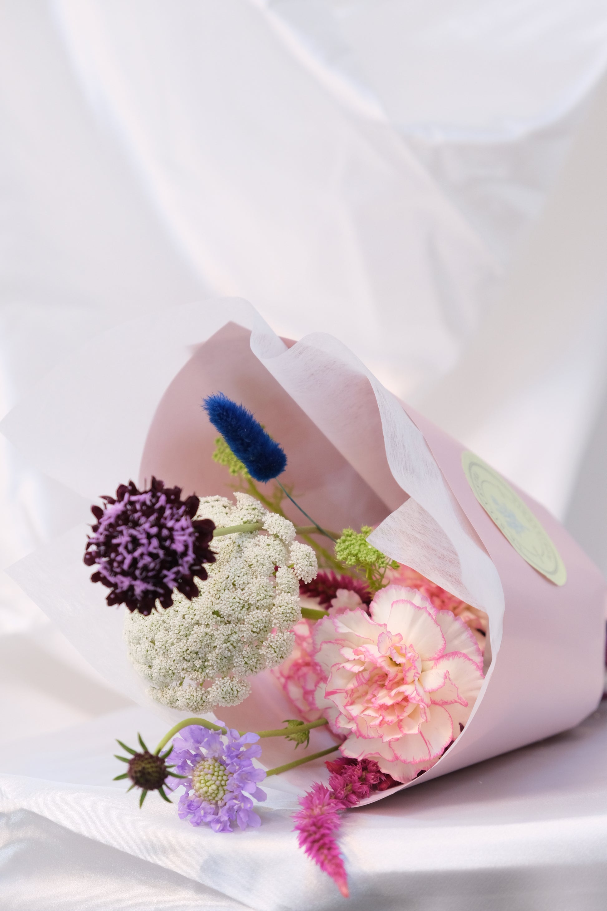 Puede incluir Escabiosas, Claveles, Celosías, Rosas, Eucaliptos, Lisianthus, Piracanto, etc.