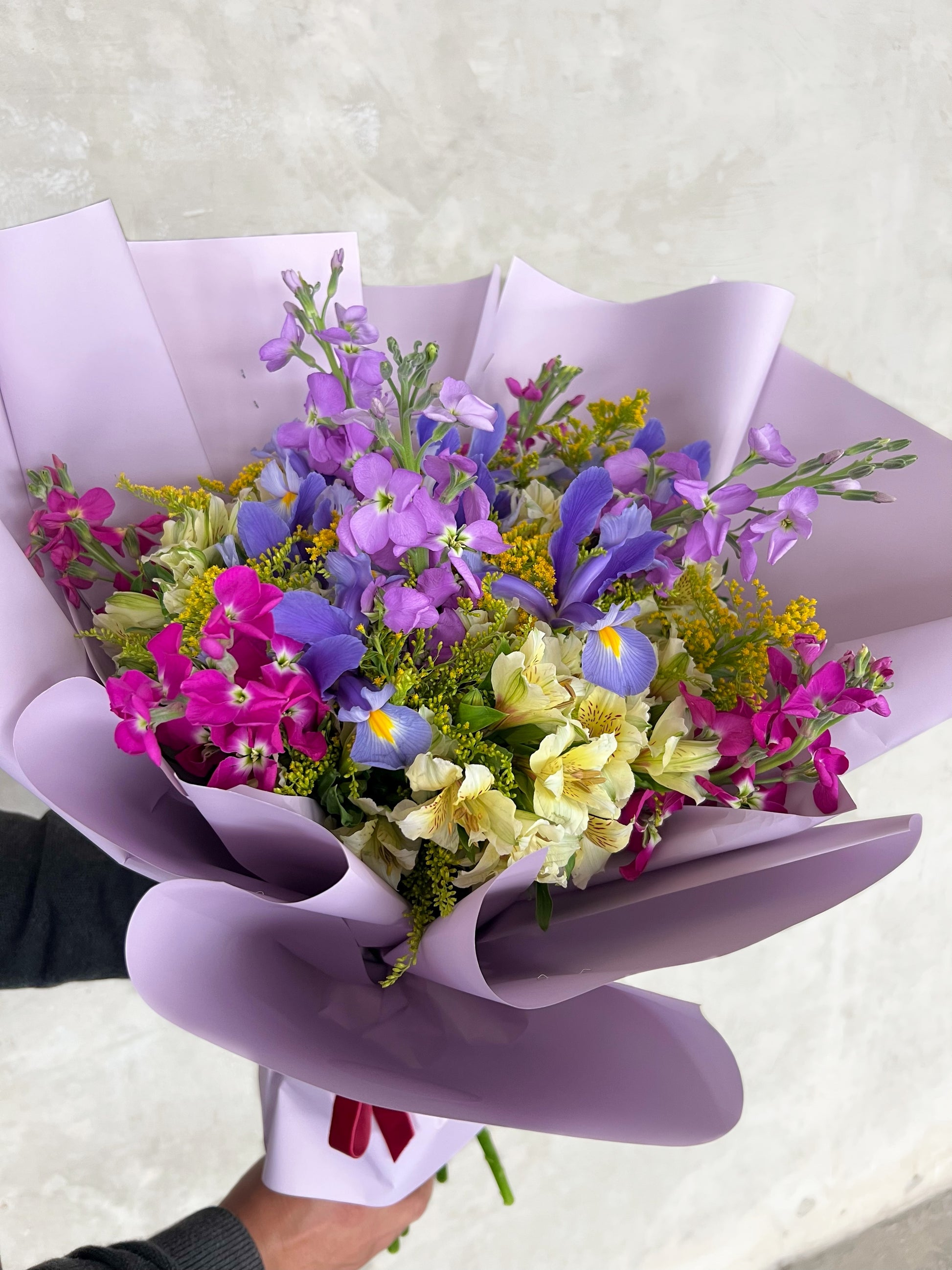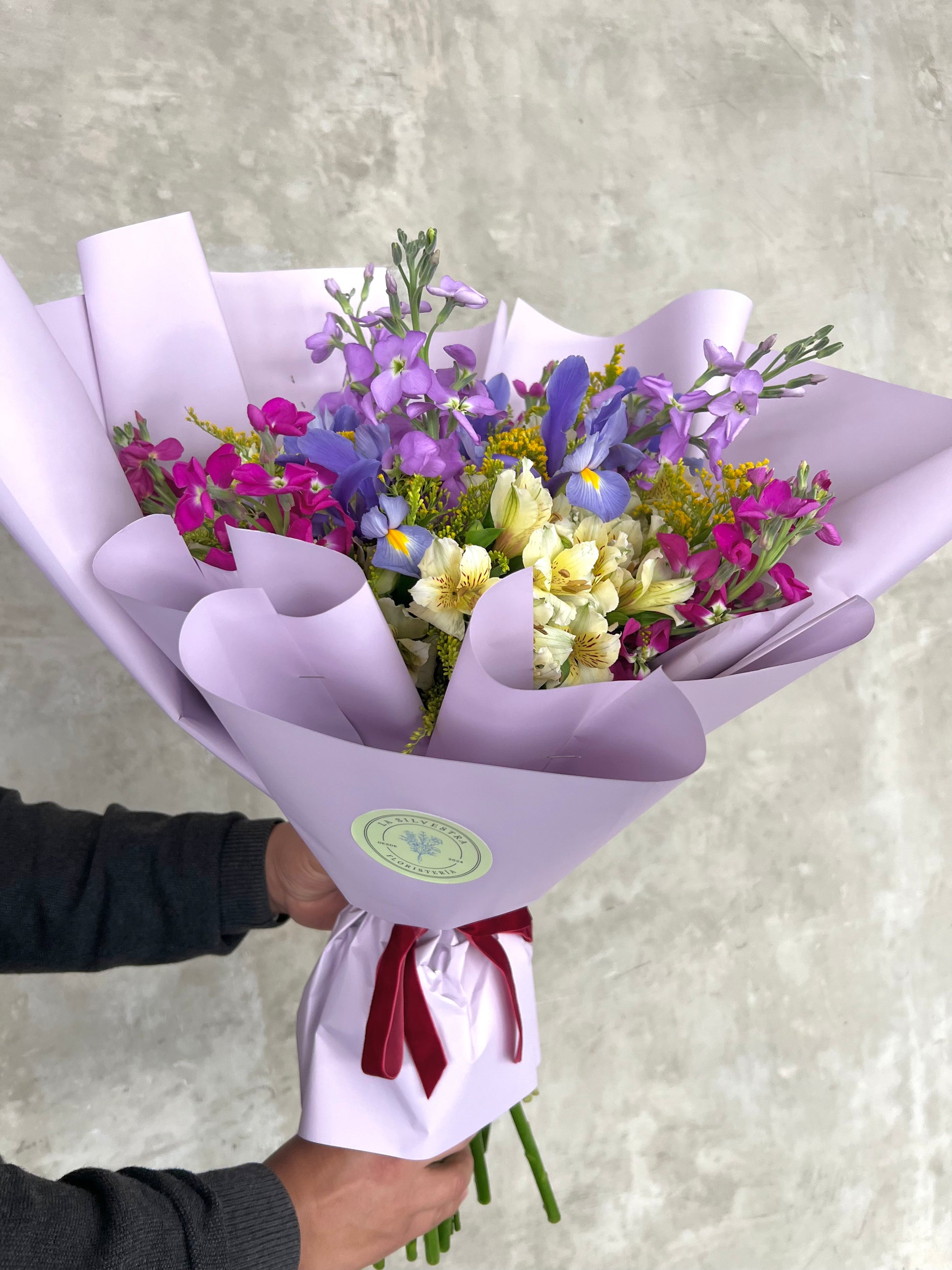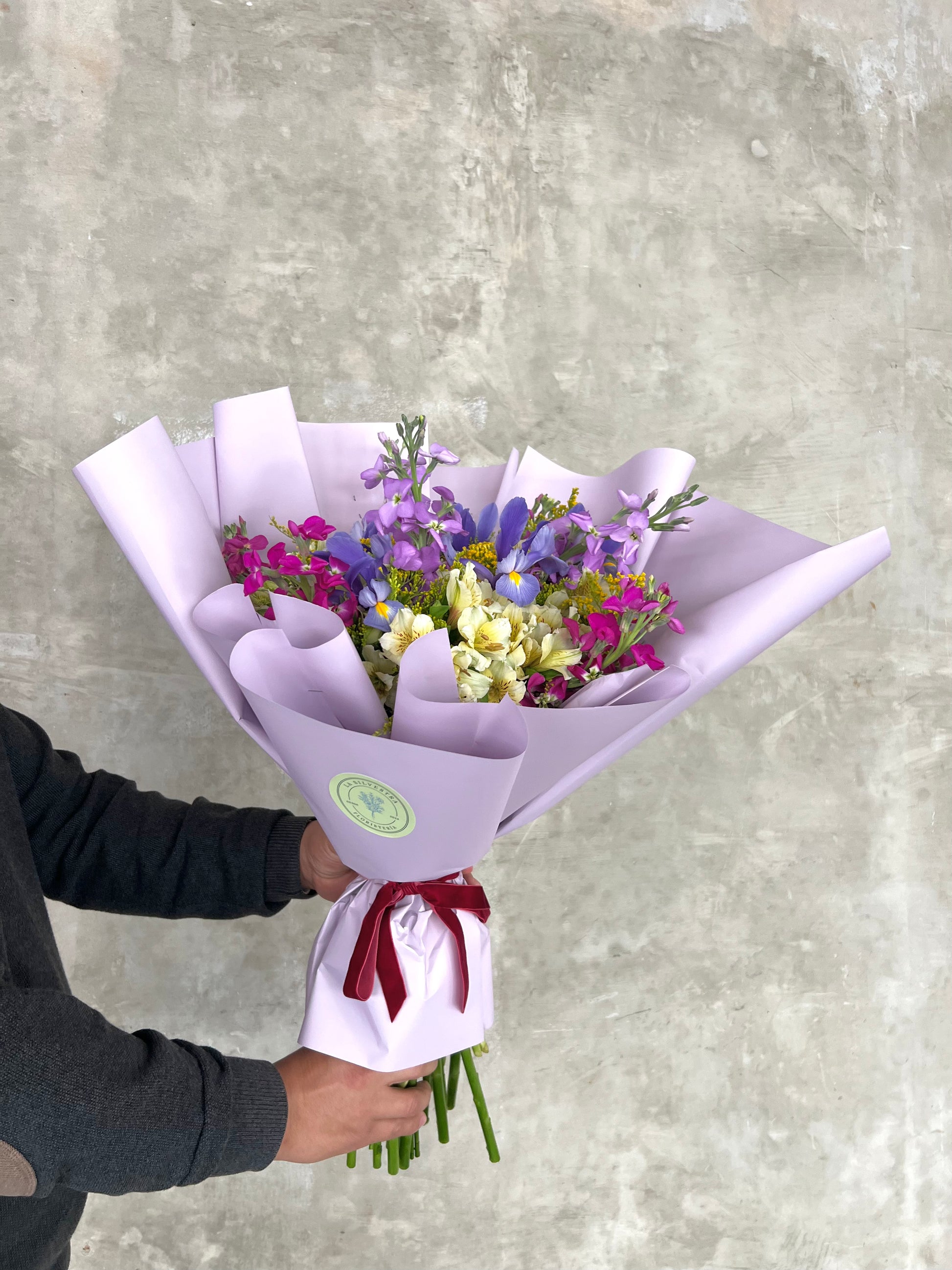 Ramo hecho a base de Alelí, Astromelias, Iris, Eucalipto, entre otros.