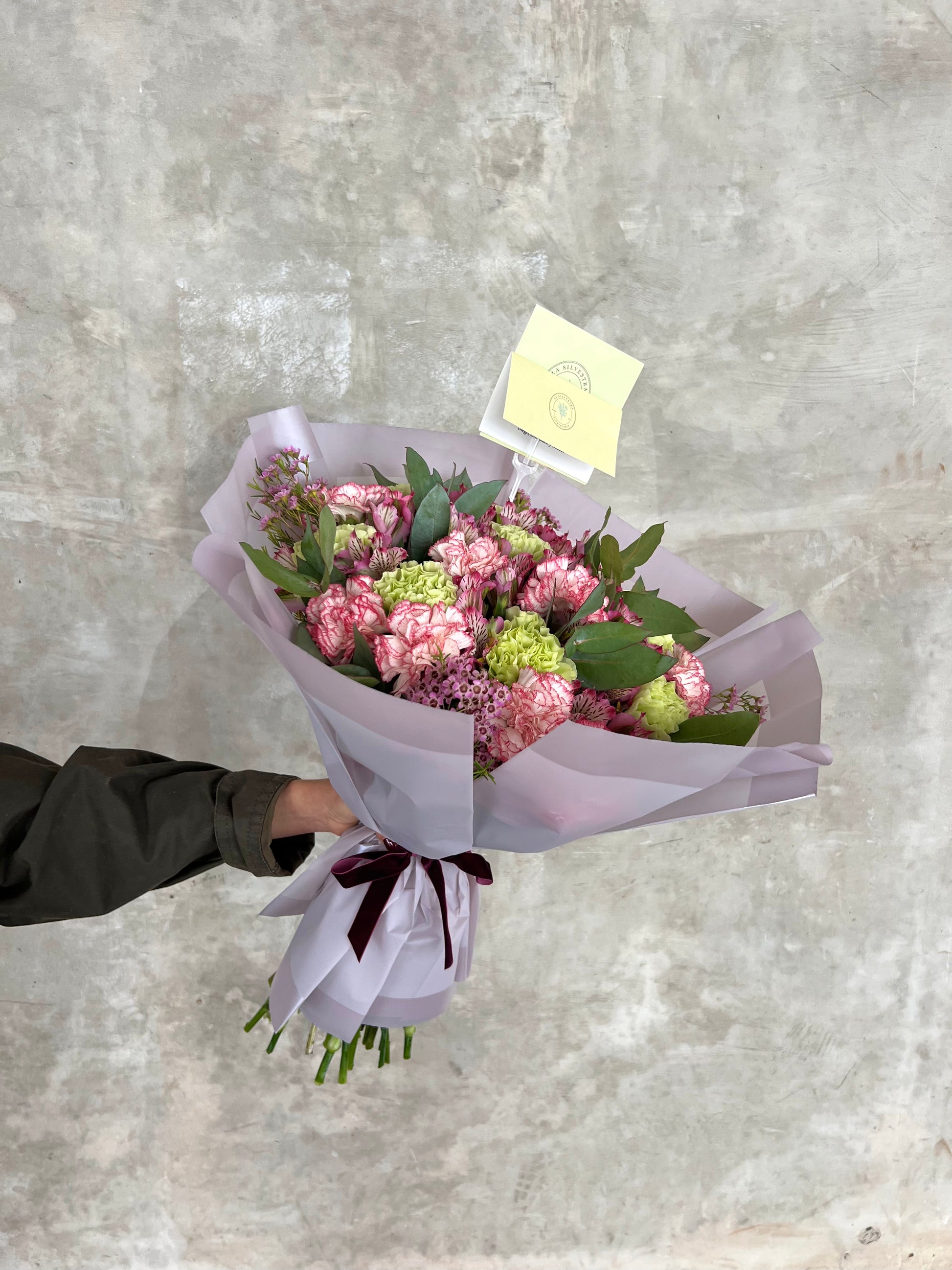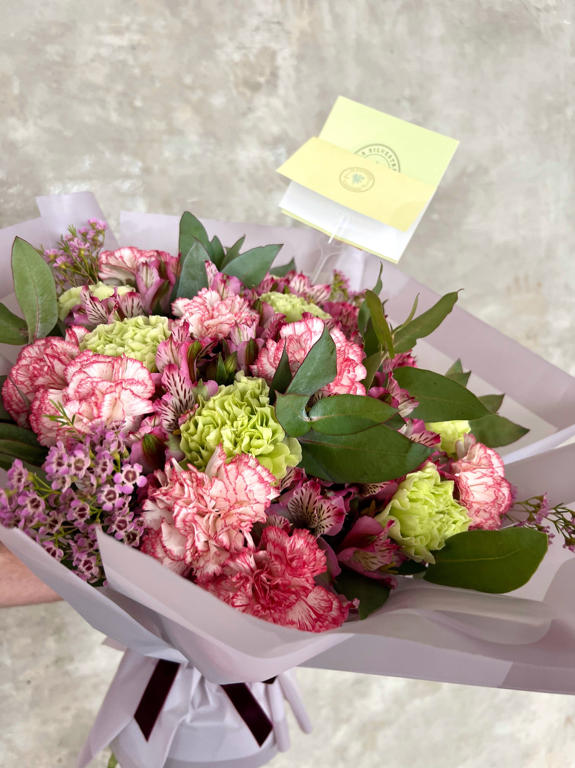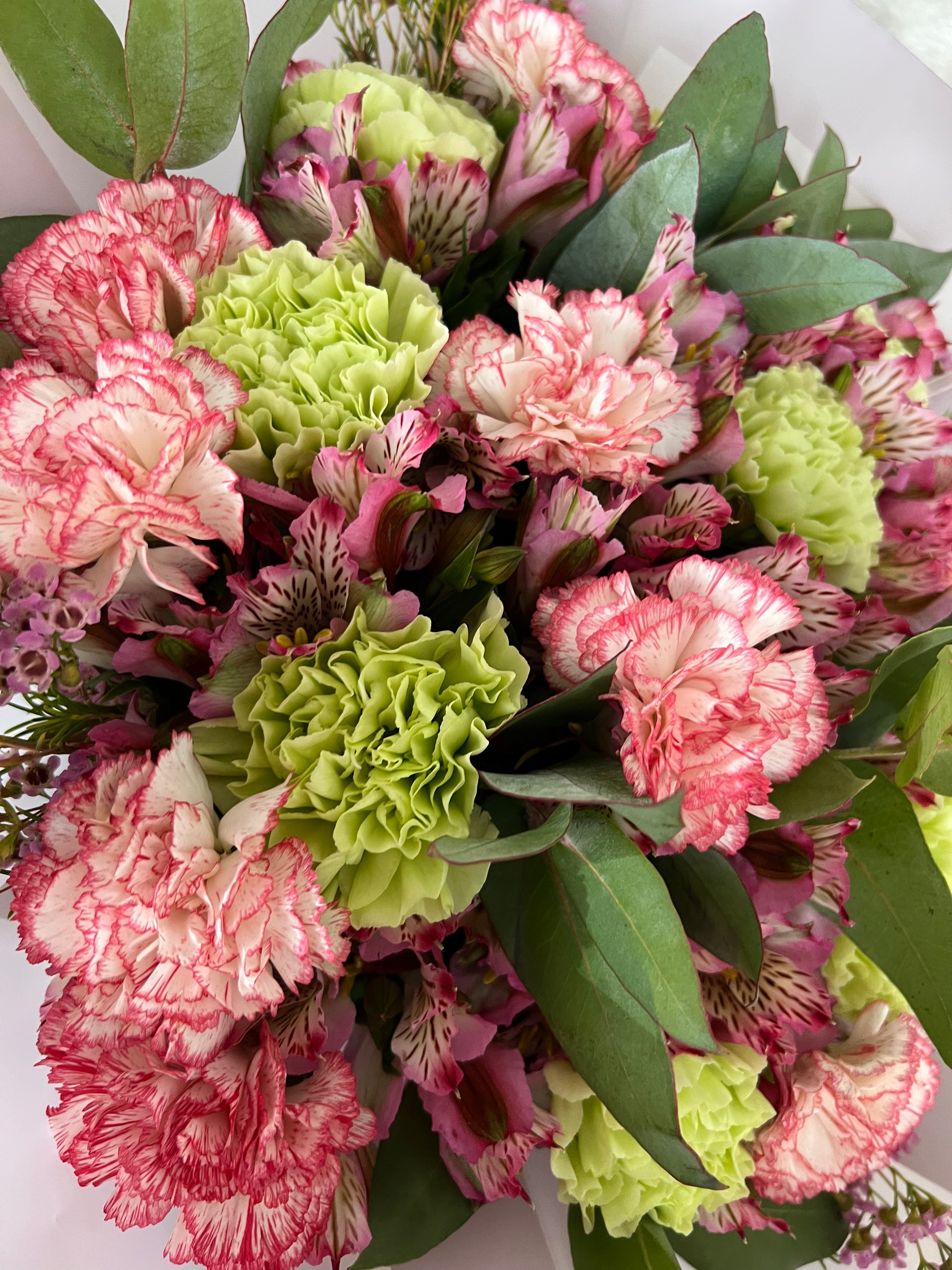 Hecho a base de Claveles importados, Astromelias, Flor de wax, Gardenias y entre otros.