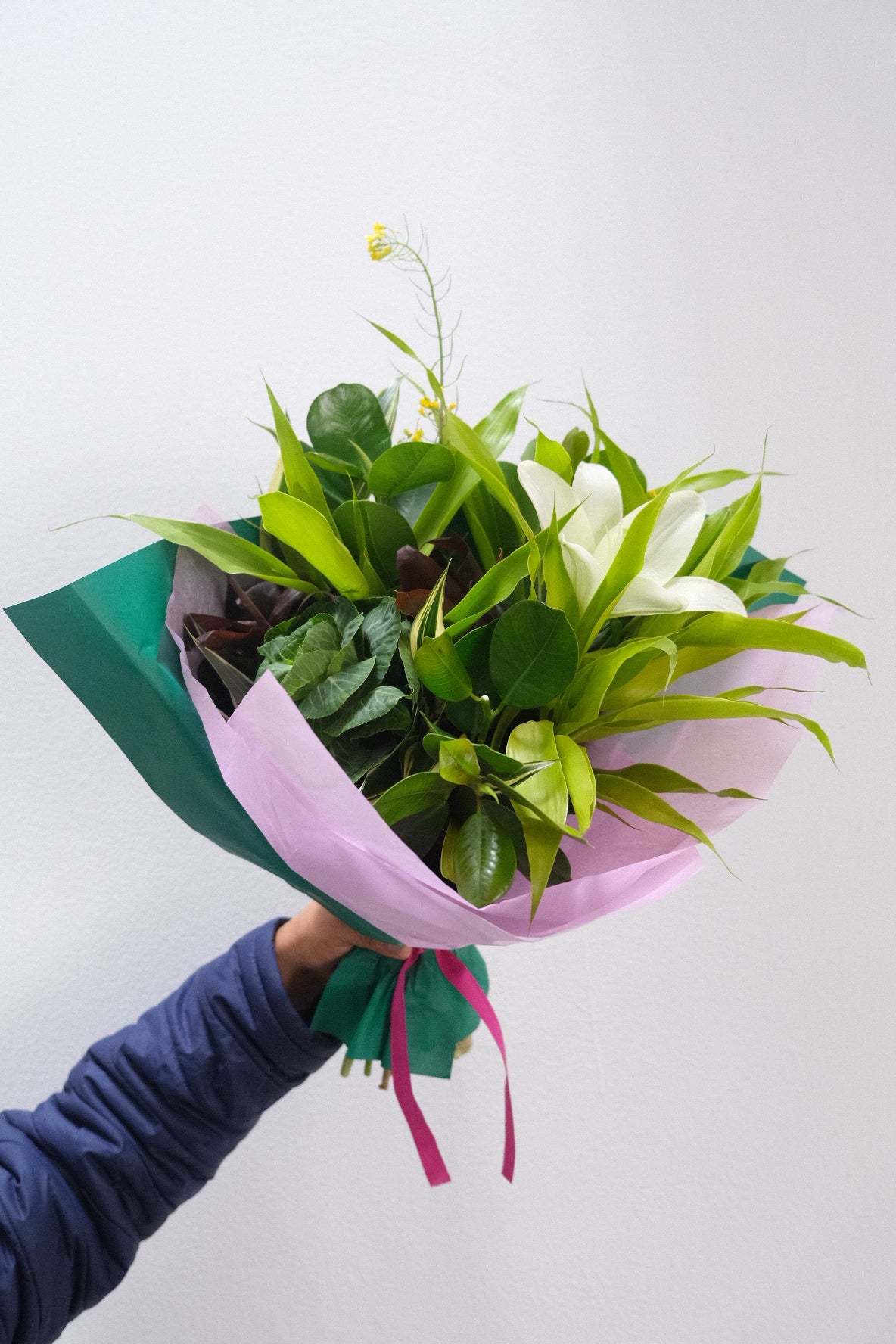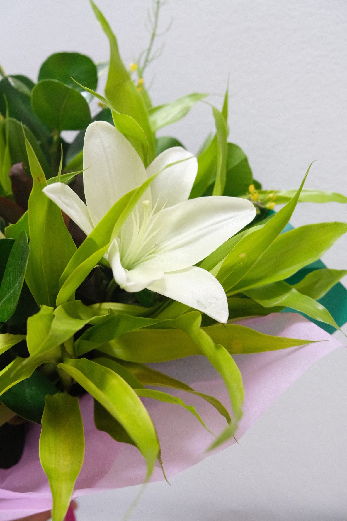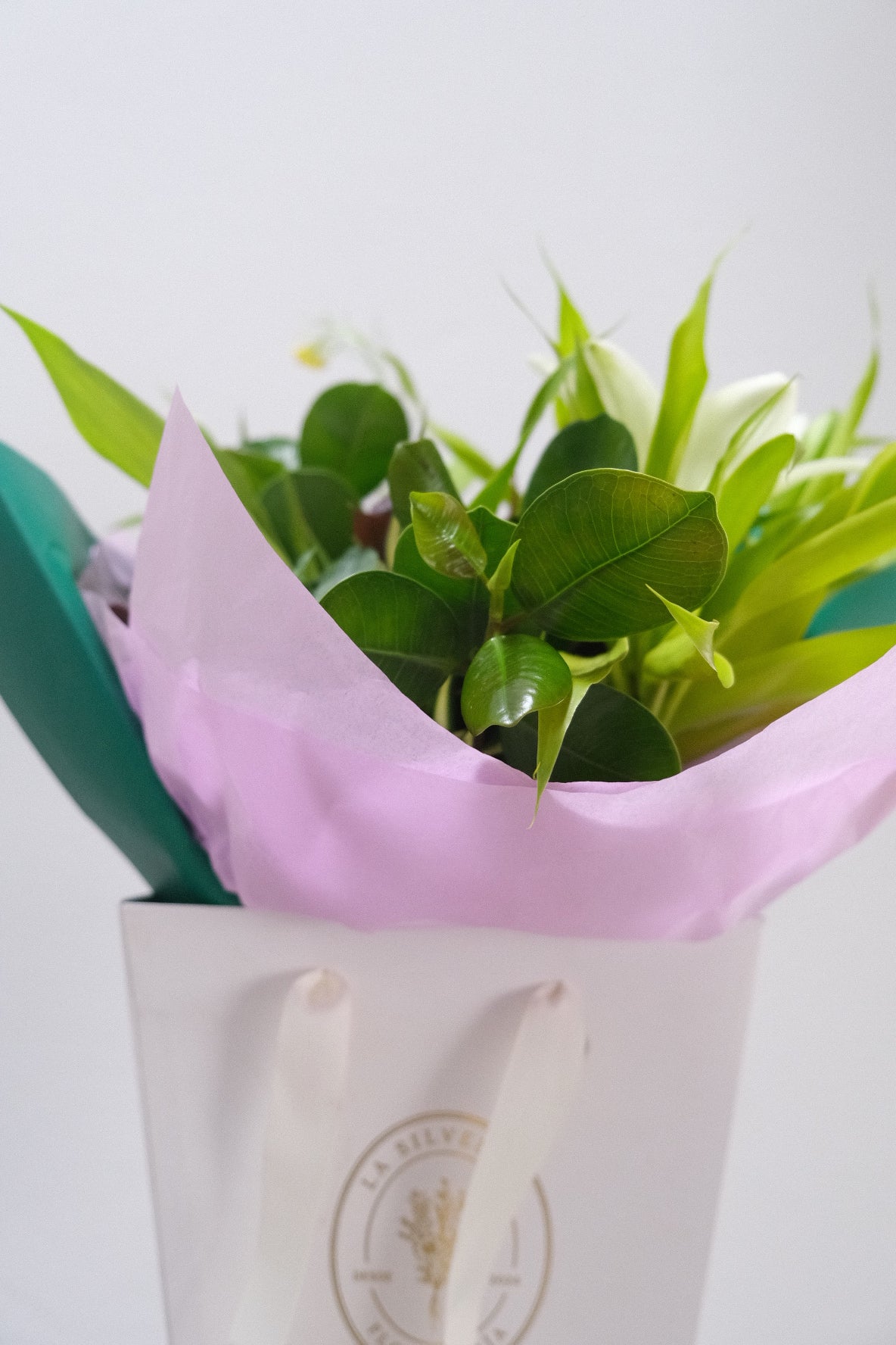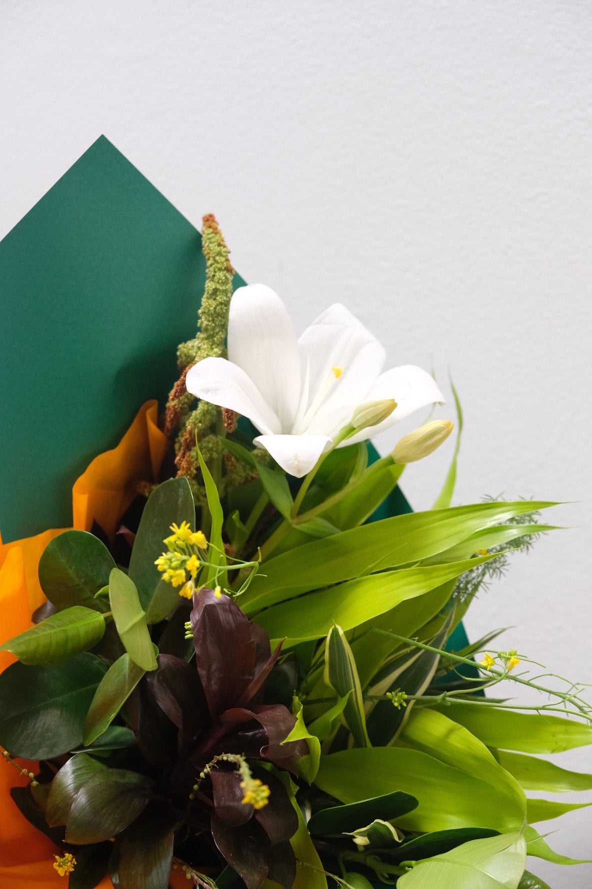 Hecho a base de follajes y flores verdes en sus distintas variedades, toques de amarillo o anaranjado y un lirio.