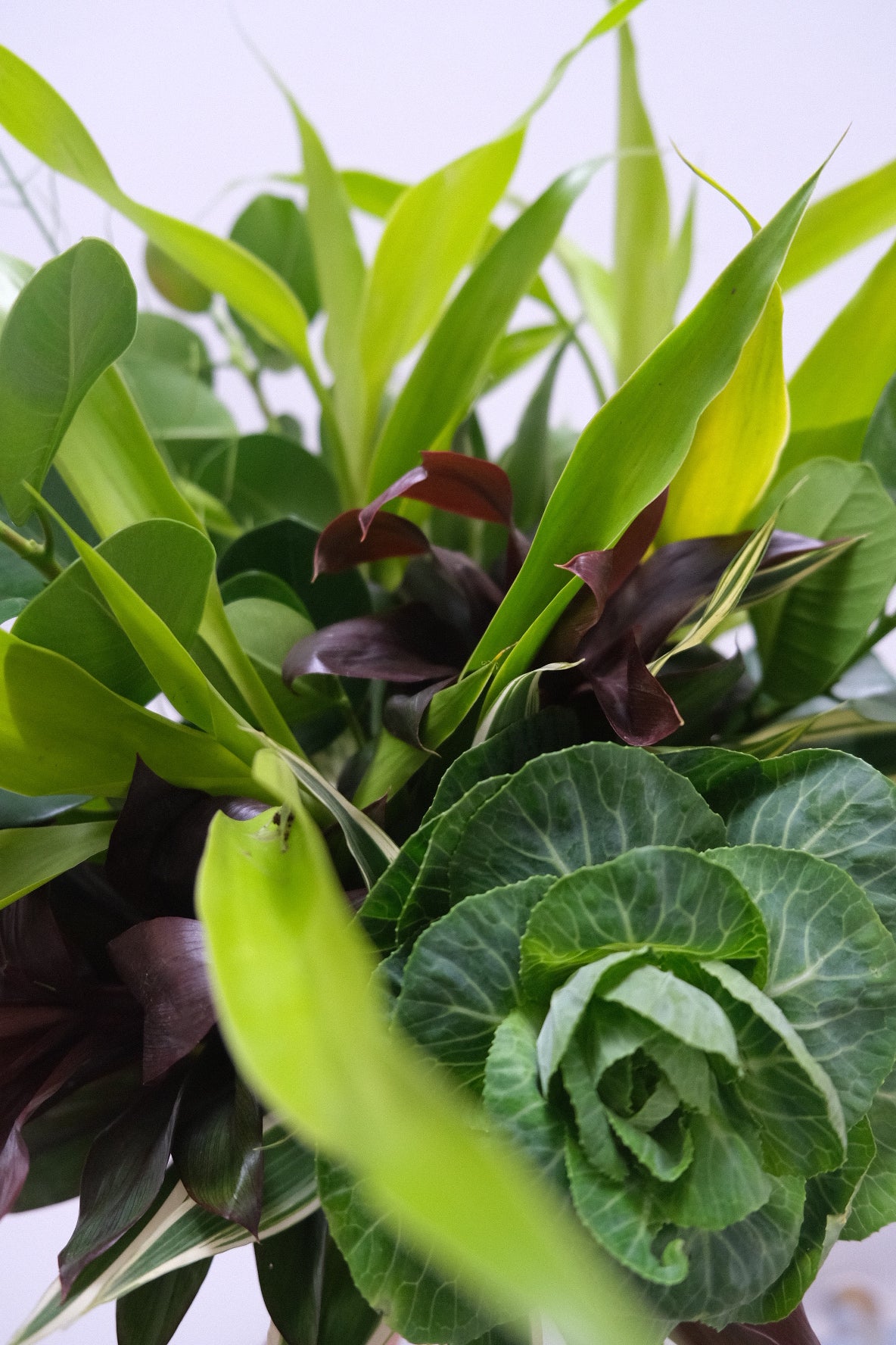 Entre las flores empleadas tenemos bambú, coprosma, amaranto, claveles verdes, ccordelina, entre otros.