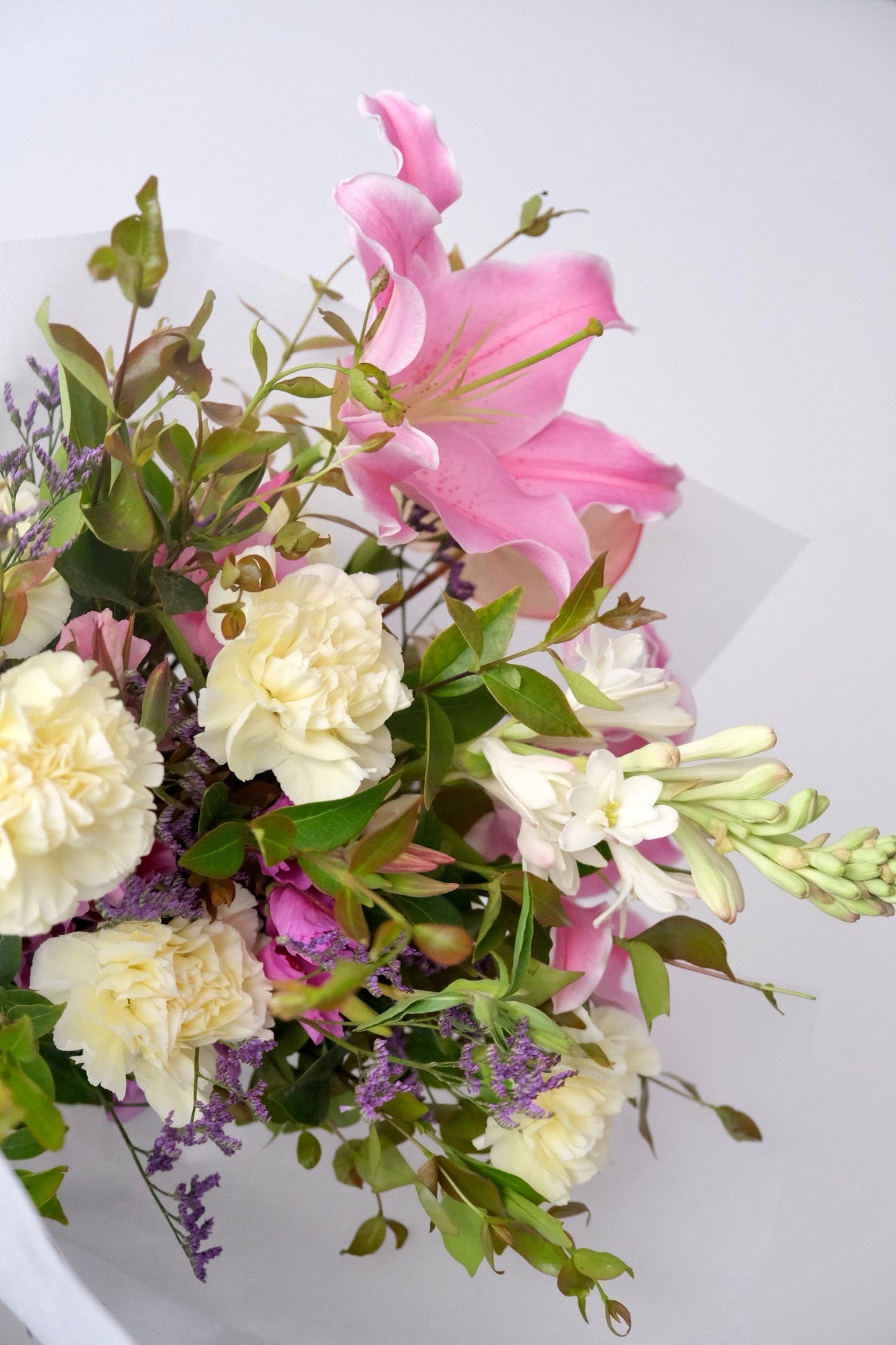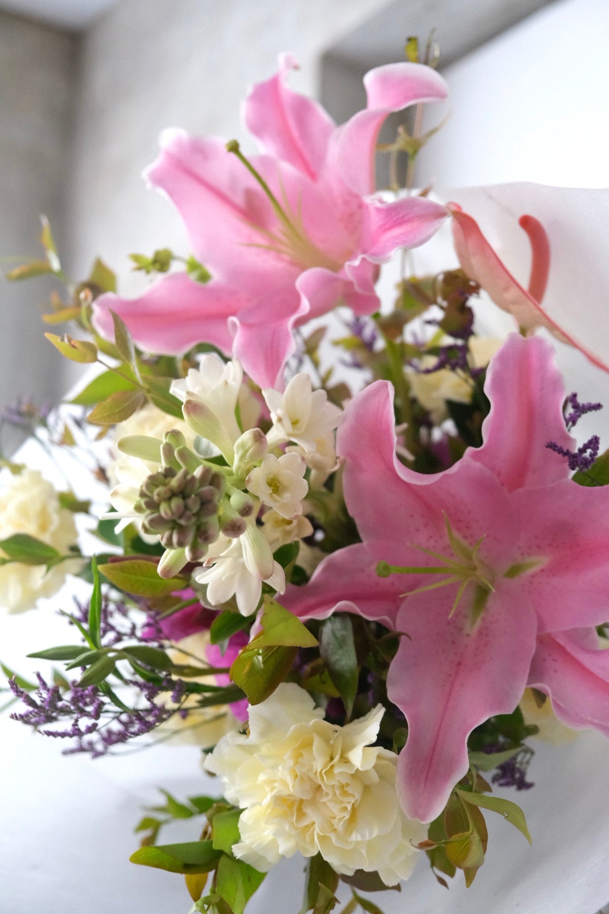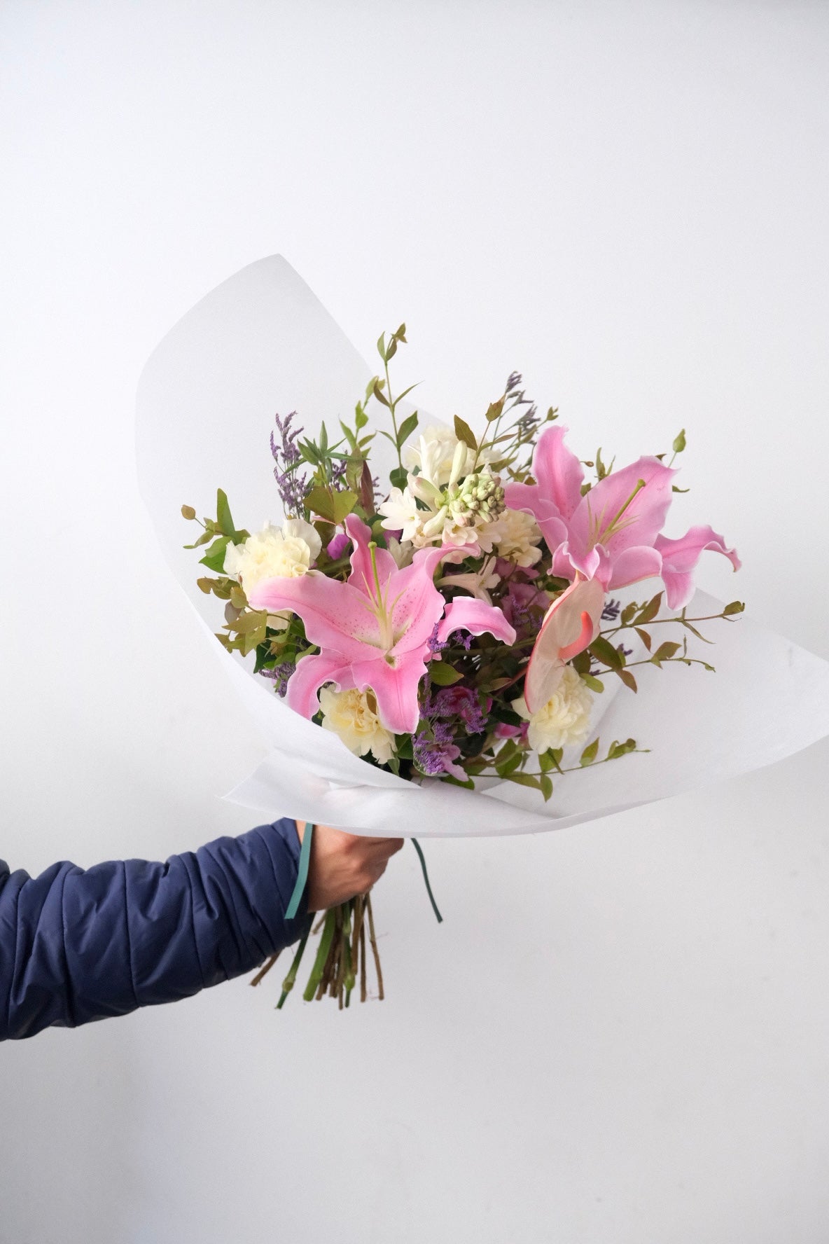 Hecho a base de lirios, anturio, claveles importados, limonium y follaje
